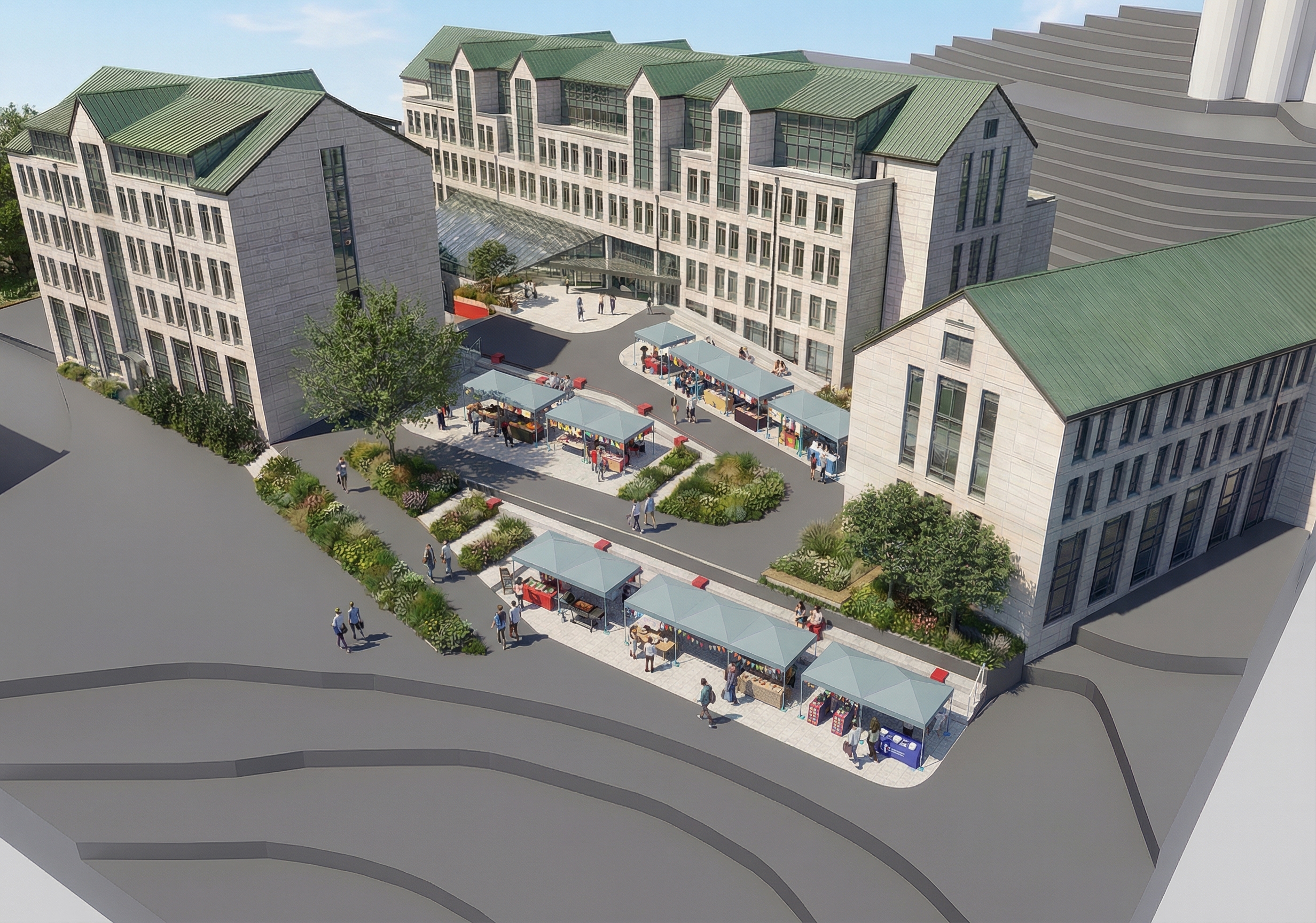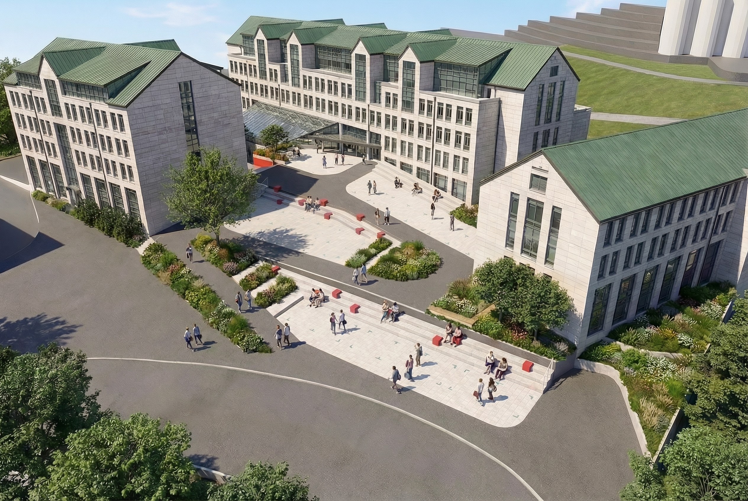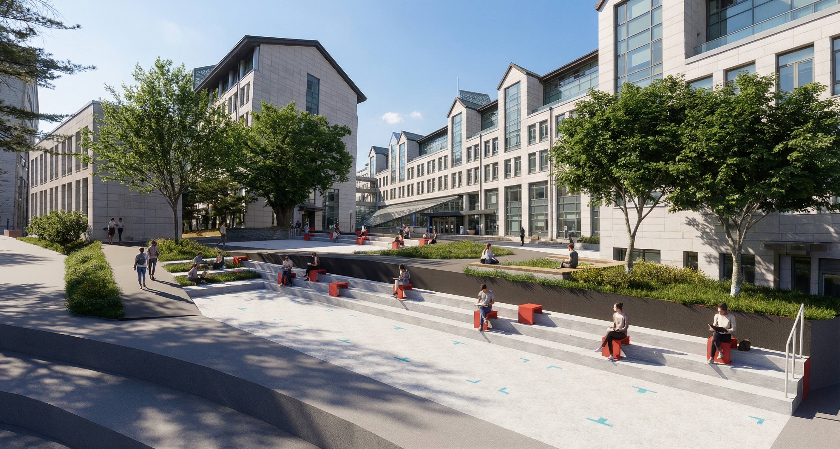 실제 사진처럼 렌더링해줘. 조경을 자연스럽게 약간만 심어줘. 맑은 하늘의 초여름. 뒤에 흰색 건물은 두번째, 세번째 사진을 참고하여 실제 사진의 건물 모습을 자연스럽게 맵핑해줘. 첫번째 사진의 카메라 구도를 변경하지마. 디자인된 중앙 광장이 잘 보이는게 중요해. 회색은 아스팔트 바닥. 대지의 토폴로지를 표현한 것. 밝은 타일로된 부분의 계단에 사람들이 앉아있음. 빨간색 테이블을 이용하는 모습. 푸르고 맑은 하늘의 점심시간대.