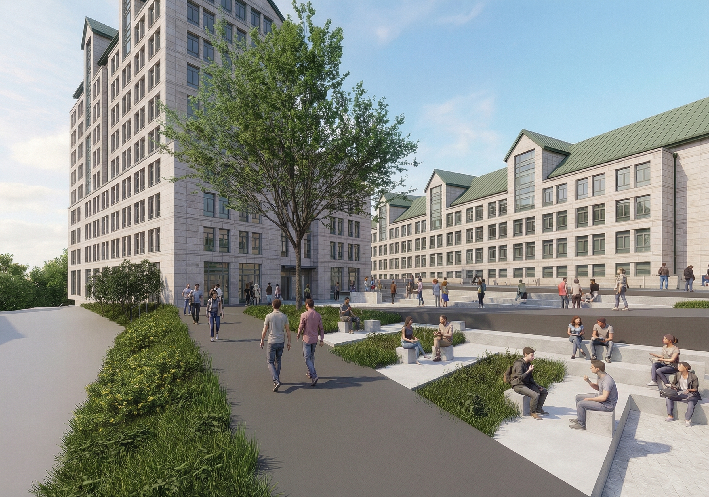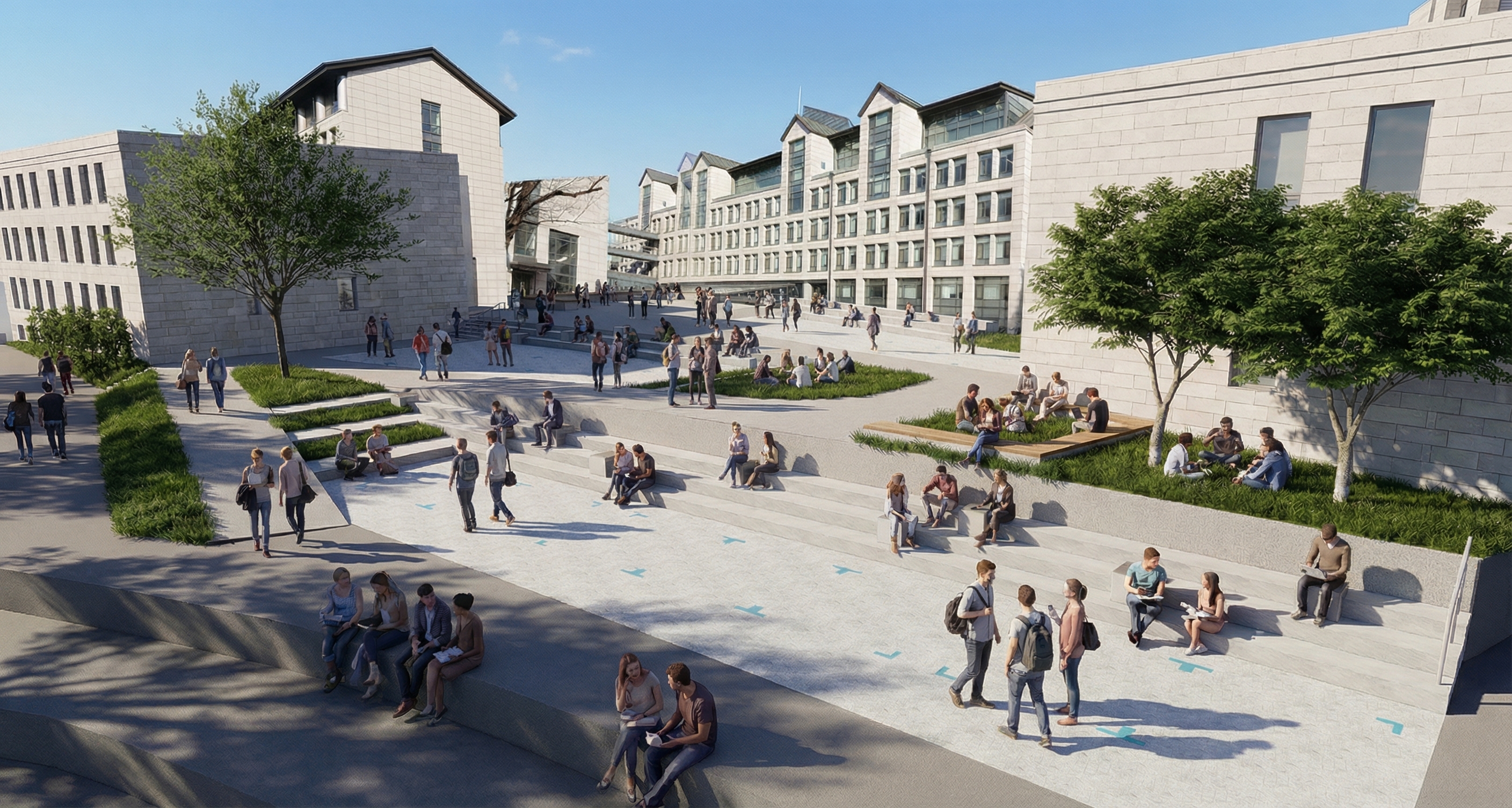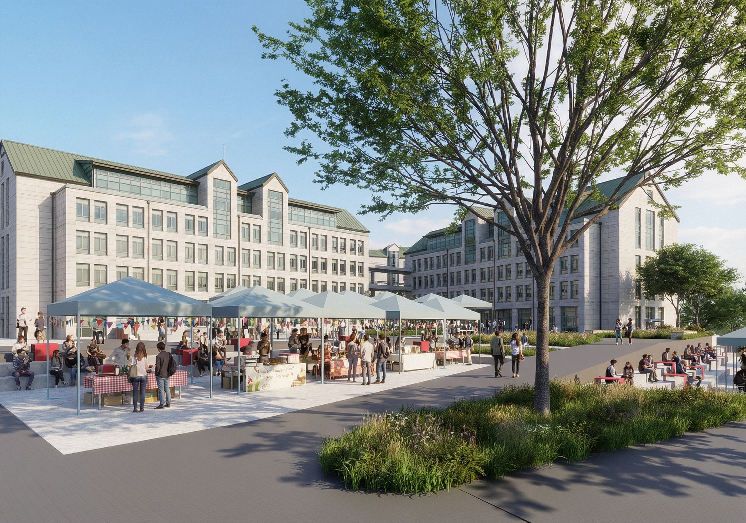 실제 사진처럼 렌더링해줘. 조경을 자연스럽게 약간만 심어줘. 맑은 하늘의 초여름. 뒤에 흰색 건물은 두번째, 세번째 사진을 참고하여 실제 사진의 건물 모습을 자연스럽게 맵핑해줘. 첫번째 사진의 카메라 구도를 변경하지마. 디자인된 중앙 광장이 잘 보이는게 중요해. 회색은 아스팔트 바닥. 대지의 토폴로지를 표현한 것. 밝은 타일로된 부분의 계단에 사람들이 앉아있음. 빨간색 테이블을 이용하는 모습. 푸르고 맑은 하늘의 점심시간대.