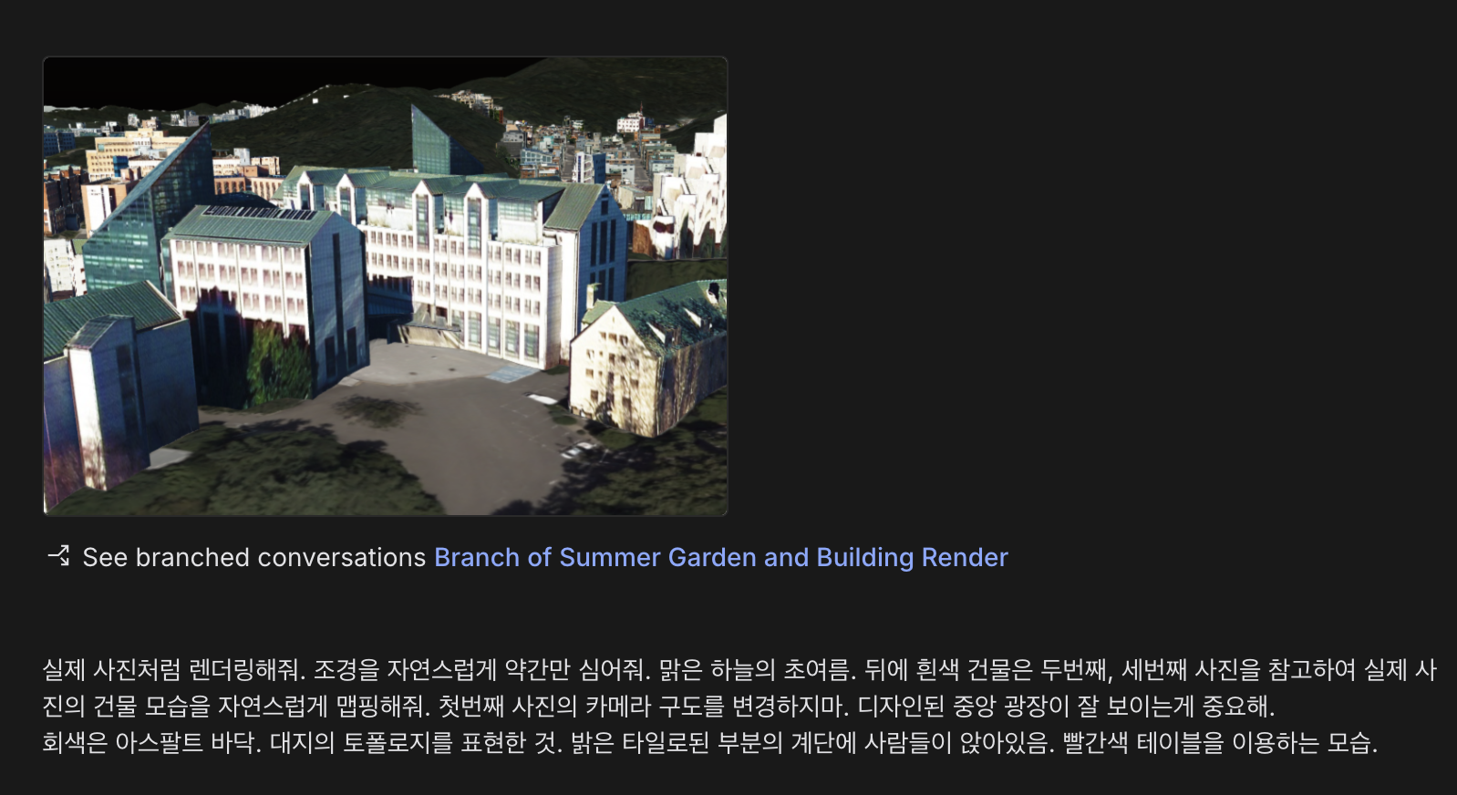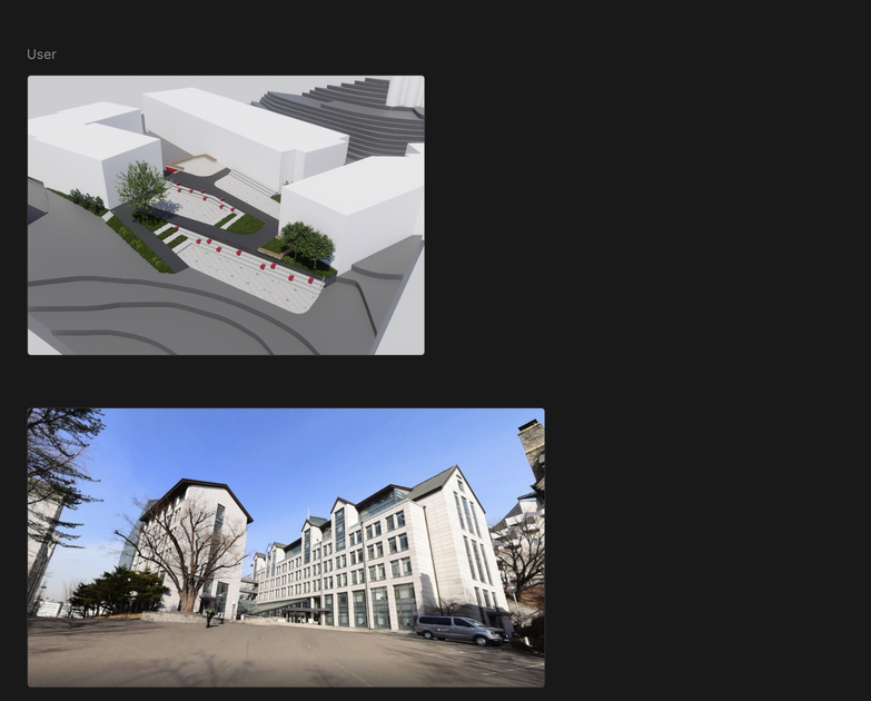 이렇듯 AI를 좀 달래면서(?) 의도가 잘 드러나는 렌더링을 얻기위해서 넉넉잡아 두 시간 정도 걸렸다. 기본 모델링과 렌더링을 팀원분이 해서 넘겨주셨는데 AI이미지에 우리의 의도를 담기위해서는 베이스 작업물을 잘 만들어두는게 중요하다는걸 다시금 느꼈다.