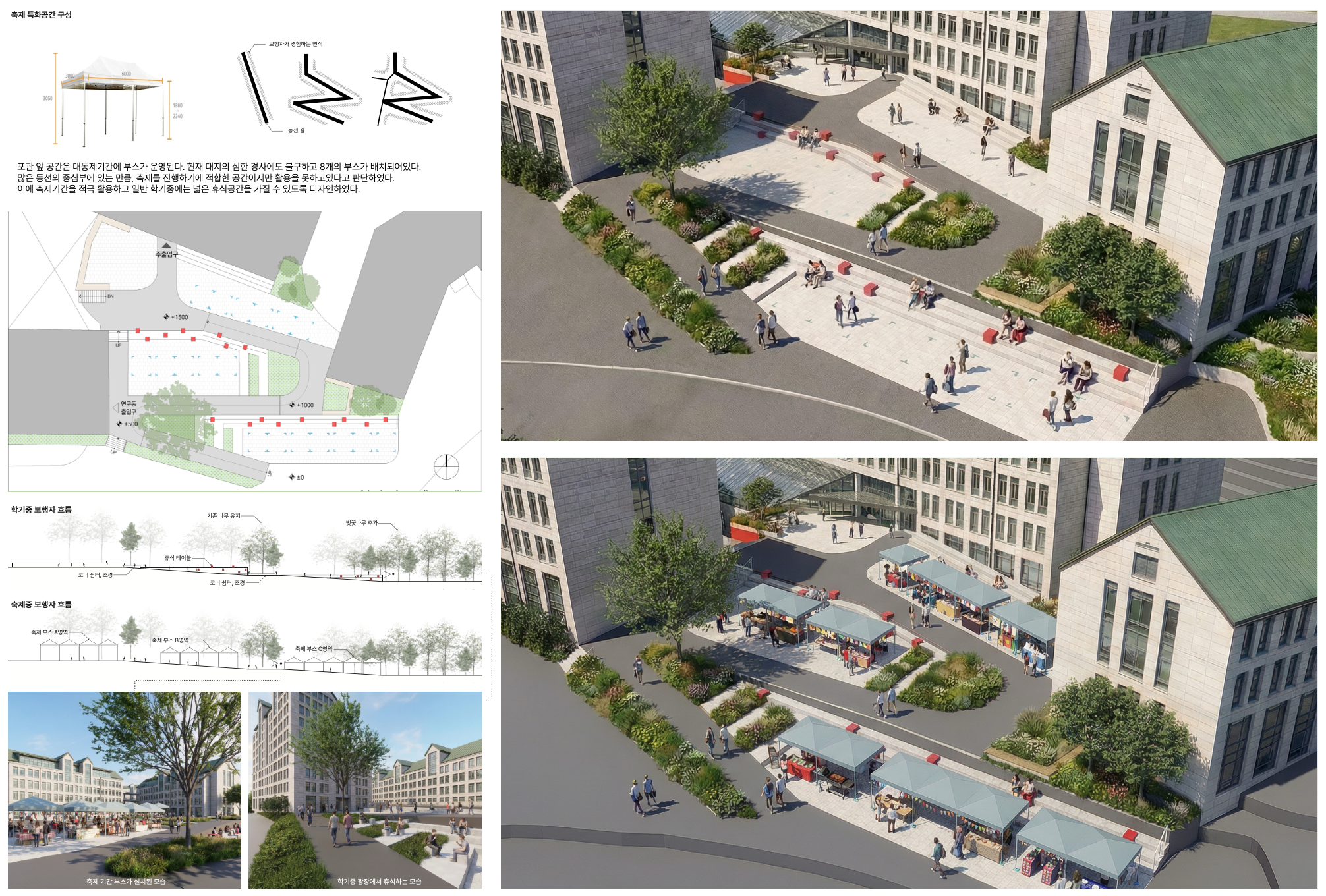 다음은 어반랜드스케이프 수업의 프로젝트로, 학교 건물 사이의 빈 공간을 디자인해서 기본 렌더링과 나노바나나프로로 리터치한 사진이다. 표현 의도를 담은 렌더링을 D5으로 작업하여 뽑고 주변 건물 맵핑과 사람을 넣어주는걸 부탁했다. 맵핑 사진은 네이버 거리뷰 사진과 smap 사진을 이용했다.